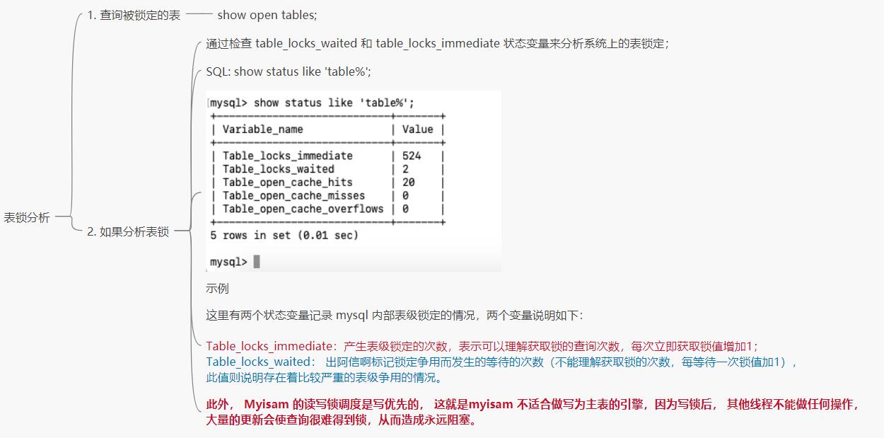 特点:偏向 MyISAM 存储引擎,开销小,加锁块;无死锁;锁定粒度大,发生锁冲突的概率高,并发度最低。