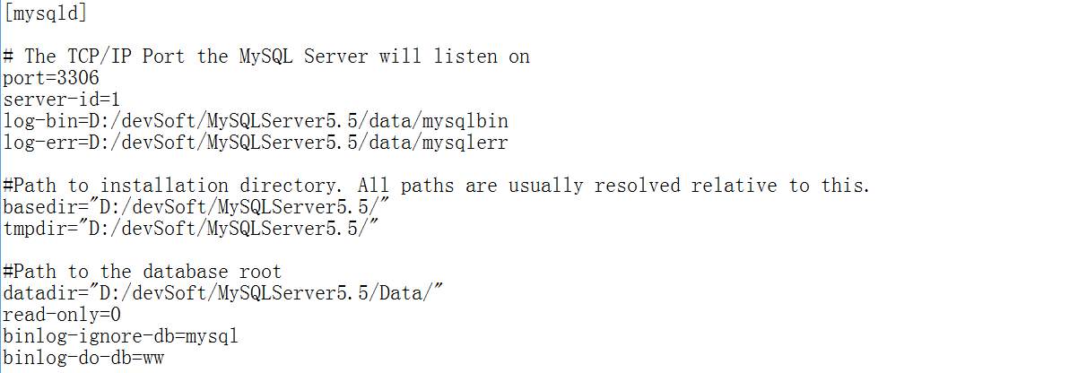 2. [必须] 启用二进制日志 log-bin = 自己的本地的路径/mysqlbin log-bin=D:/devsoft/mysql5.7/data/mysqlbin