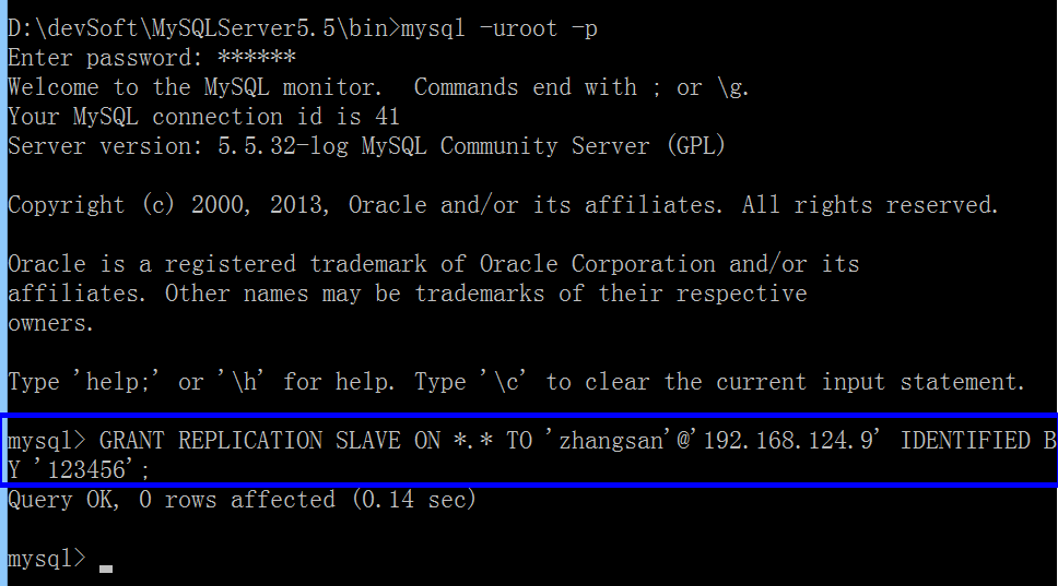 | grant replication slave on *.* to 'zhangsan'@'从库IP' identified by '123456';