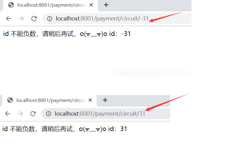 public String paymentCircuitBreaker_fallback(@PathVariable("id") Integer id) { return "id 不能负数,请稍后重试,o(╥﹏╥)o id:" + id; }
