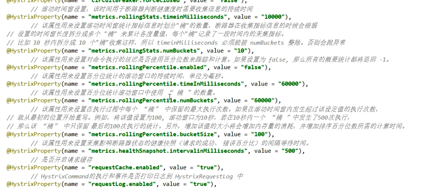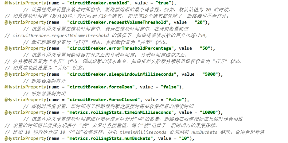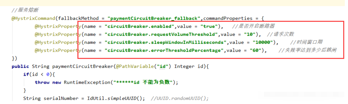 @HystrixCommand( fallbackMethod = "paymentCircuitBreaker_fallback", commandProperties = { @HystrixProperty(name = "circuitBreaker.enabled", value = "true"),// 是否开启断路器 @HystrixProperty(name = "circuitBreaker.requestVolumeThreshold", value = "10"),// 请求次数 @HystrixProperty(name = "circuitBreaker.sleepWindowInMilliseconds", value = "10000"),// 时间窗口期/时间范文 @HystrixProperty(name = "circuitBreaker.errorThresholdPercentage", value = "60")// 失败率达到多少后跳闸 } ) public String paymentCircuitBreaker(@PathVariable("id") Integer id) { if (id < 0) { throw new RuntimeException("*****id不能是负数"); } String serialNumber = IdUtil.simpleUUID(); return Thread.currentThread().getName() + "\t" + "调用成功,流水号:" + serialNumber; }