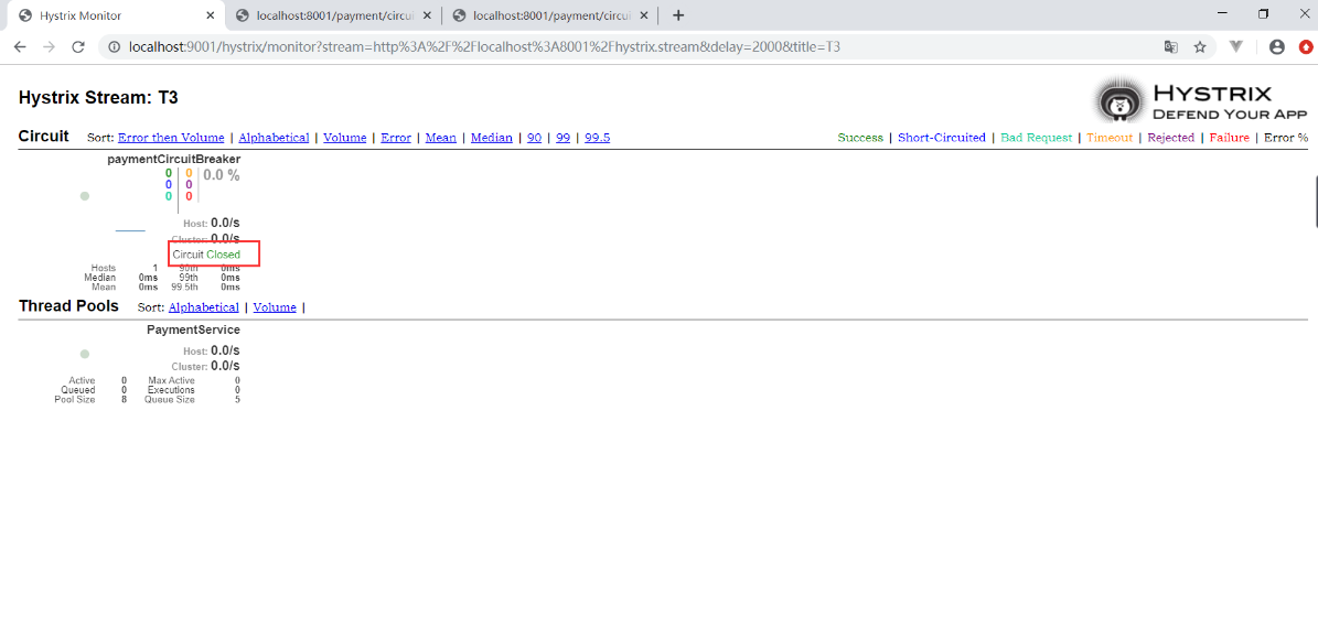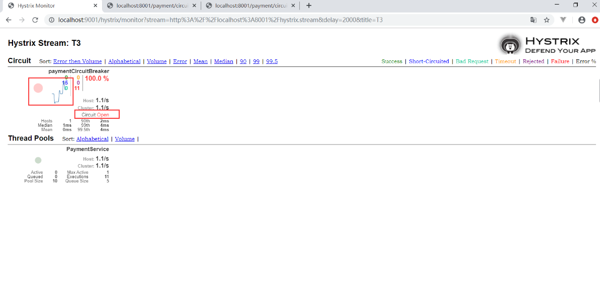 当请求次数越多,流量越多,图中小球会越来越大,没有触发熔断时,Circuit 显示 Closed ,触发熔断显示Open