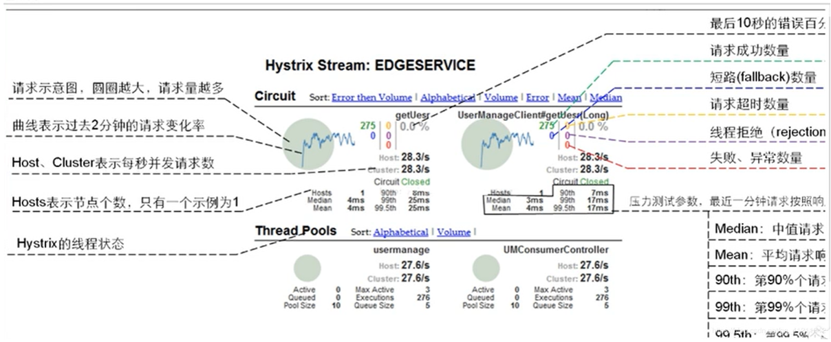 除了隔离依赖服务的调用意外,Hystrix还提供了准实时的调用监控(Hystrix Dashboard),Hystrix会持续的记录所有通过Hystrix发起的请求的执行信息,并以统计报表和图形的形式展示给用户,包括每秒执行多少请求多少成功,多少失败等。Netflix 通过 hystrix-metrics-event-stream项目实现了对以上指标的监控。SpringCloud也提供了Hystrix Dashboard的整合,对监控内容转化成可视化界面。