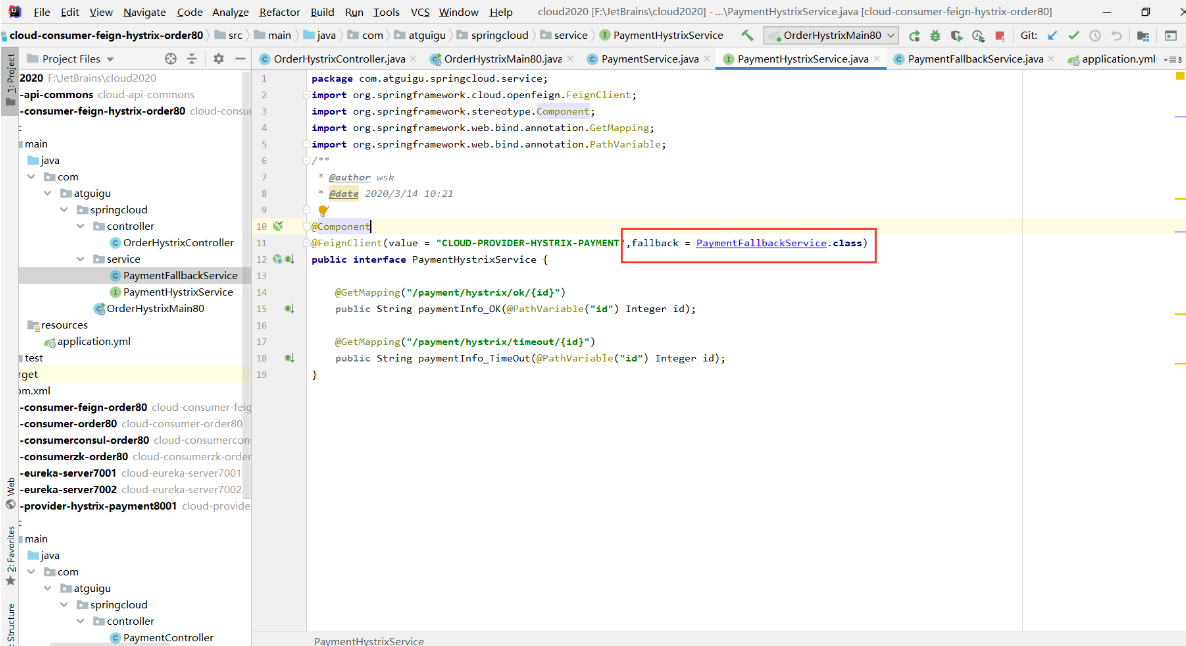 | package com.atguigu.springcloud.service; @Component public class PaymentFallbackService implements PaymentHystrixService { @Override public String paymentInfo_OK(Integer id) { return "-----PaymentFallbackService fall back-paymentInfo_OK ,o(╥﹏╥)o"; }