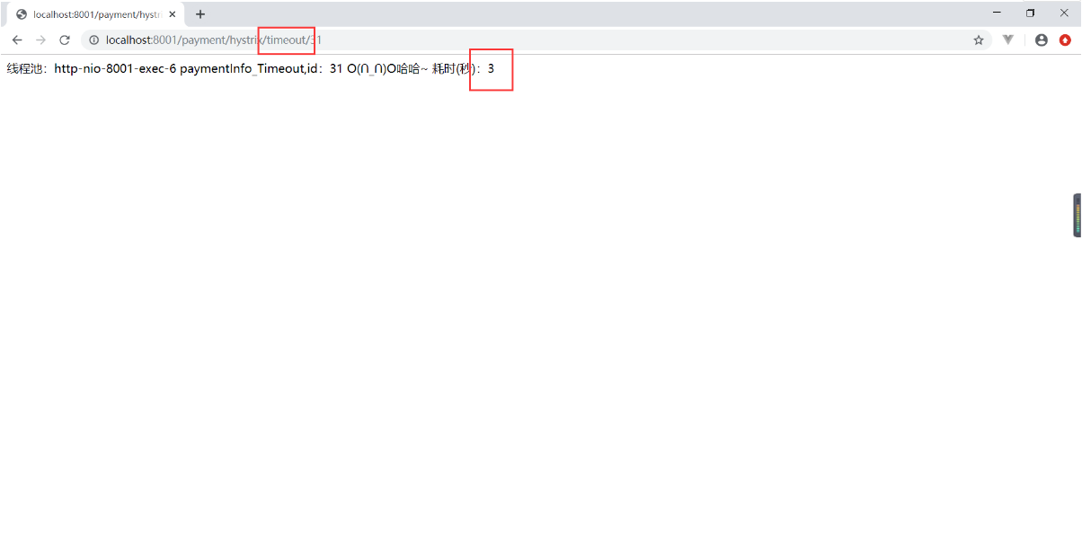 public String paymentInfo_Timeout(Integer id){ int timeNumber = 3; try{ TimeUnit.SECONDS.sleep(timeNumber); }catch (InterruptedException e){ e.printStackTrace(); } return "线程池:"+Thread.currentThread().getName()+" paymentInfo_Timeout,id:"+id+"\t"+"O(∩_∩)O哈哈~"+" 耗时(秒):"+timeNumber; } }