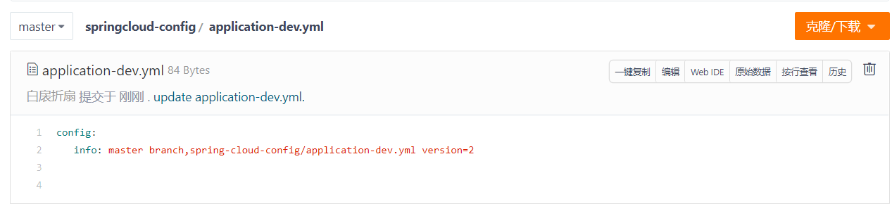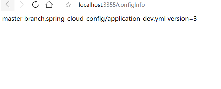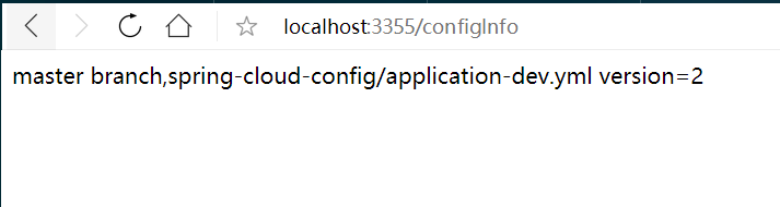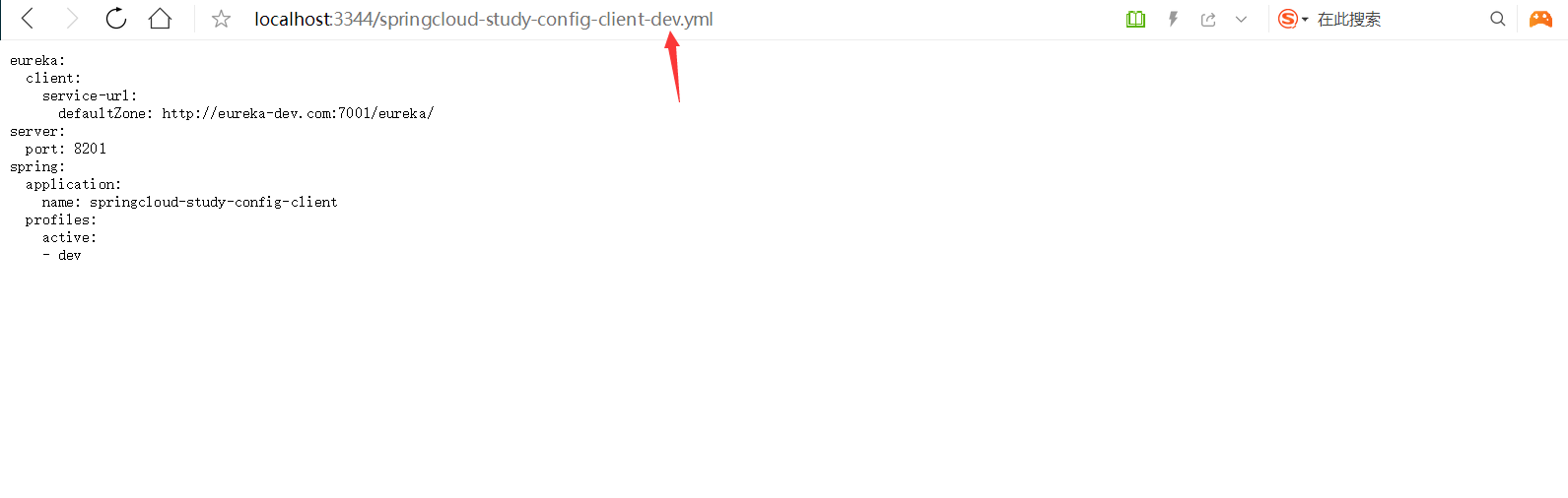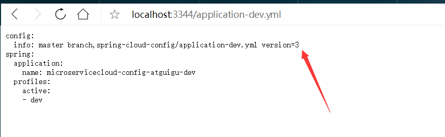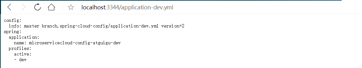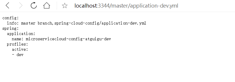 这样就读到了github上的文件内容。说一下这个访问地址的组合,前面我们配置了hosts文件映射,所以能用config-3344.com代替localhost,master 指的是git仓库的master分支,config-test.yml 指的就是这个分支上的文件,就是这样访问的。