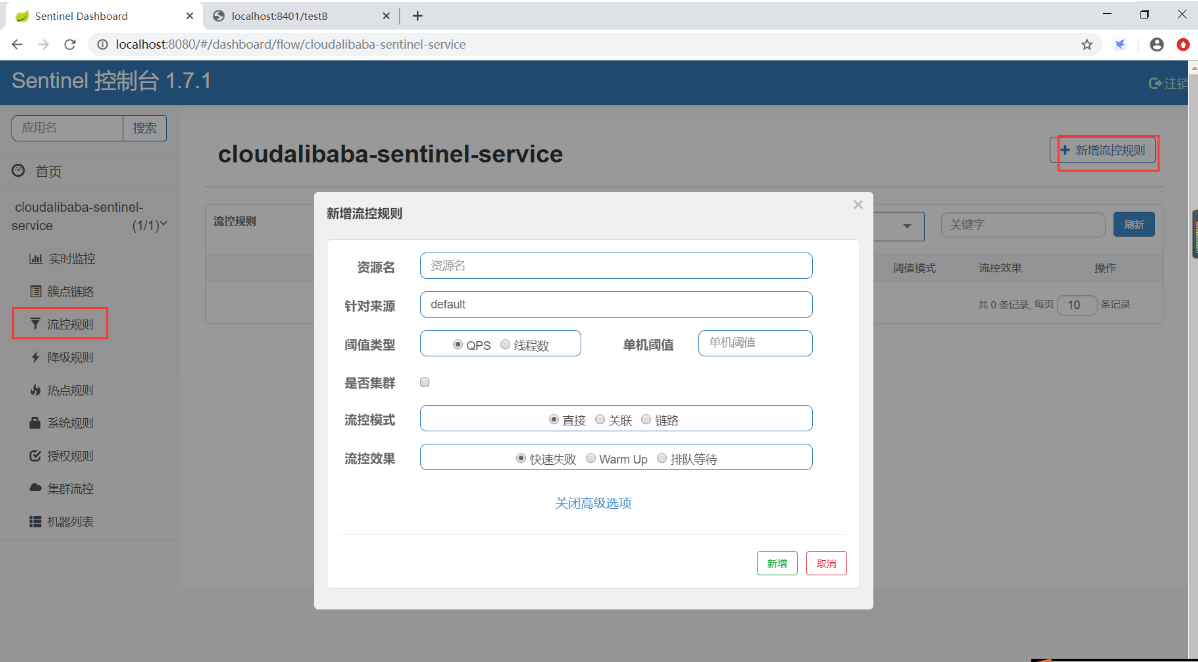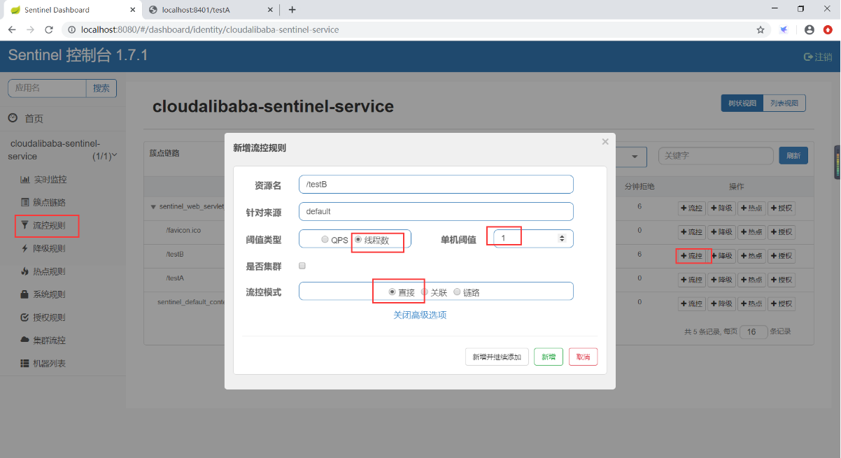 - 线程数:当调用该api的线程数达到阈值的时候,进行限流
