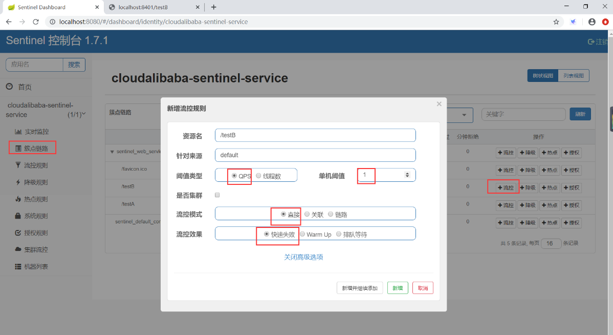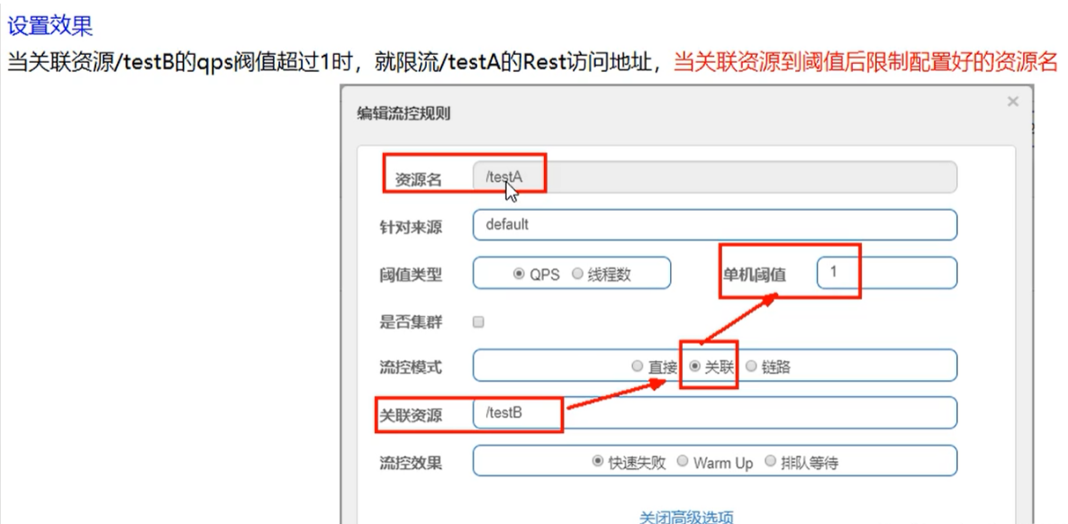 - 链路:只记录指定链路上的流量(指定资源从入口资源进来的流量,如果达到阈值,就进行限流)