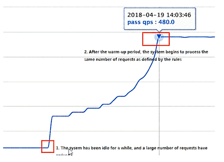 Warm Up方式,即预热/冷启动方式。当系统长期处于低水位的情况下,当流量突然增加时,直接把系统拉升到高水位可能瞬间把系统压垮。通过“冷启动”,让通过的流量缓慢增加,在一定时间内逐渐增加到阈值上限,给冷系统一个预热的时间,避免冷系统被压垮。