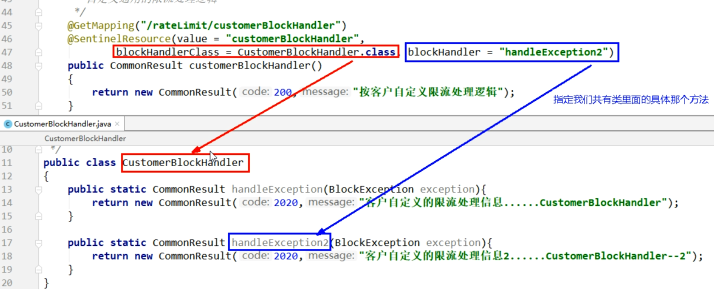 | @GetMapping("/rateLimit/customerBlockHandler") @SentinelResource(value = "customerBlockHandler", blockHandlerClass = CustomerBlockHandler.class, blockHandler = "handlerException2") public CommonResult customerBlockHandler() { return new CommonResult(200,"按客戶自定义",new Payment(2020L,"serial003")); }