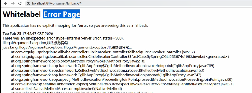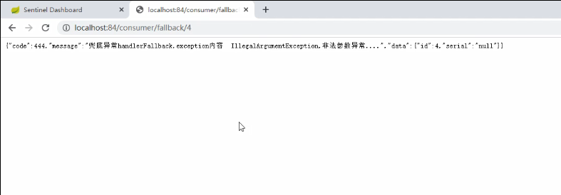 @RequestMapping("/consumer/fallback/{id}") @SentinelResource(value = "fallback",fallback = "handlerFallback",blockHandler = "blockHandler", exceptionsToIgnore = {IllegalArgumentException.class}) public CommonResult<Payment> fallback(@PathVariable Long id) { CommonResult<Payment> result = restTemplate.getForObject(SERVICE_URL + "/paymentSQL/"+id, CommonResult.class,id);