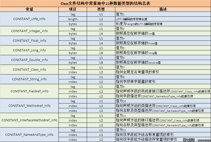 常量池的总体结构:Java 类所对应的常量池主要由常量池数量与常量池数组(常量表)这两部分共同构成。常量池数量紧跟在主版本号后面,占据 2 个字节;常量池数组紧跟在常量池数量之后。常量池数组与一般的数组不同的是,常量池数组中不同的元素类型、结构都是不同的,长度当然也就不同;但是,每一种元素的第一个数据都是一个 u1 类型,该字节是一个标志位,占据 1 个字节。JVM 在解析常量池时,会根据这个 u1 类型来获取元素的具体类型。