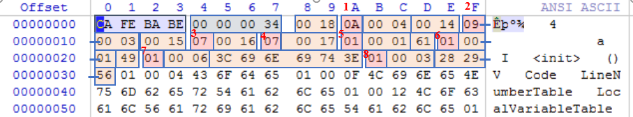 魔数:所有的.class字节码文件的前4个字节都是魔数,魔数值为固定值:0xCAFEBABE (詹姆斯.高斯林设计的,蕴意:咖啡宝贝,java 的图标是咖啡。