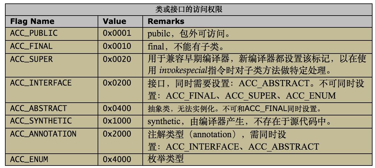 5. 访问标志 访问标志(Access_Flag)信息包括该 Class 文件是类还是接口,是否被定义成 public,是否是 abstract,如果是类,是否被声明成 final。通过上面的源代码,我们可以知道该文件是类并且是 public。