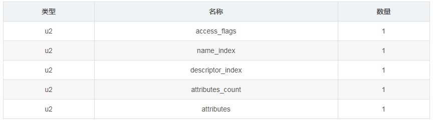 1 2 3 4 5 6 7 field_info { u2 access_flags; // 0002 表示私有 private u2 name_index; // 0005 表示 a u2 descriptor_index; // 0006 表示 I u2 attributes_count; // 0000 没有 attribute_info attributes[attributes_count]; }