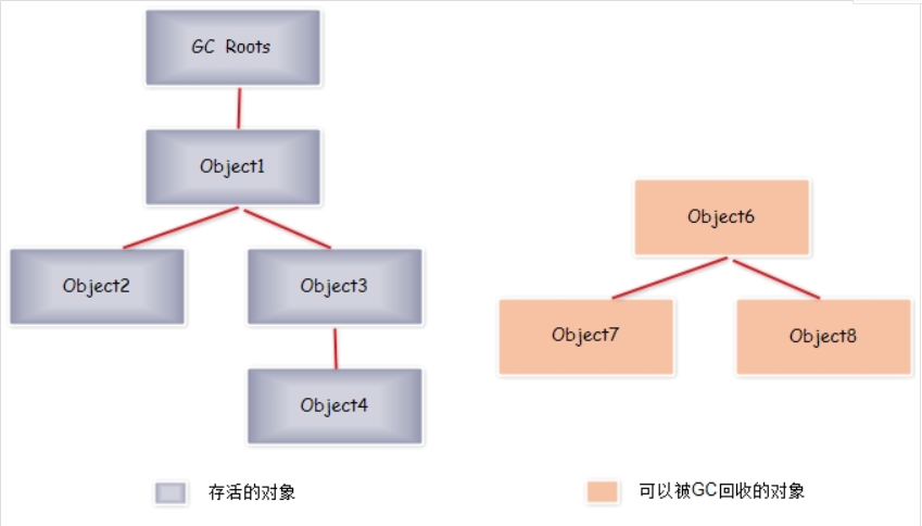 基本思路就是通过一系列“GC Roots”的对象作为起始点,从这个被称为GC Roots 的对象开始向下搜索,如果一个对象到GC Roots没有任何引用链相连时,则说明此对象不可用。也即给定一个集合的引用作为根出发,通过引用关系遍历对象图,能被便利到的对象就被判定为存活;没有被便利到的就被判定为死亡