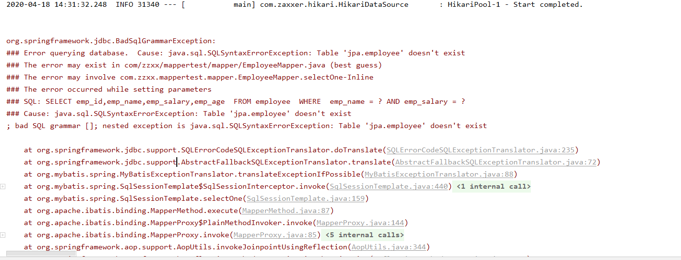 | @SpringBootTest class MapperTestApplicationTests { @Autowired EmployeeMapper employeeMapper; @Test public void testSelectOne() {