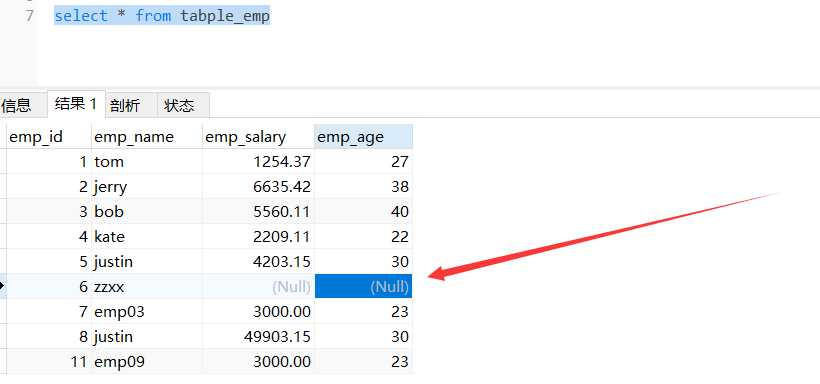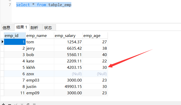 INSERT INTO `tabple_emp` (`emp_name`,`emp_salary`,`emp_age`)VALUES('tom','1254.37','27'); INSERT INTO `tabple_emp` (`emp_name`,`emp_salary`,`emp_age`)VALUES('jerry','6635.42','38'); INSERT INTO `tabple_emp` (`emp_name`,`emp_salary`,`emp_age`)VALUES('bob','5560.11','40'); INSERT INTO `tabple_emp` (`emp_name`,`emp_salary`,`emp_age`)VALUES('kate','2209.11','22'); INSERT INTO `tabple_emp` (`emp_name`,`emp_salary`,`emp_age`)VALUES('justin','4203.15','30');