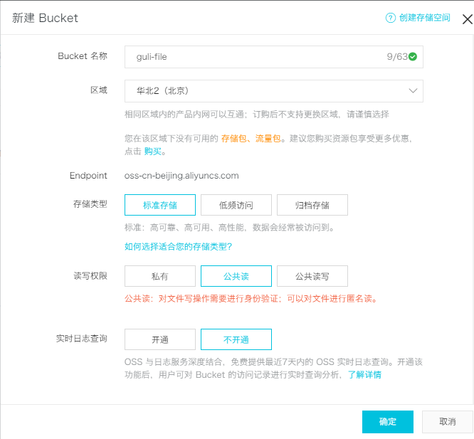 选择:标准存储、公共读、不开通