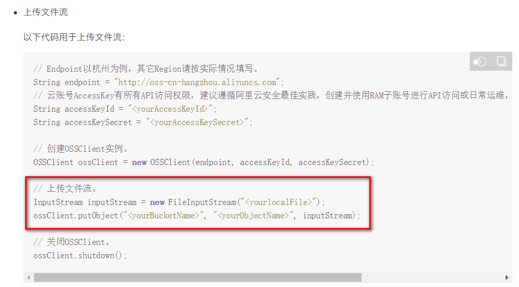 ossClient.putObject(bucketName, fileUrl, inputStream);