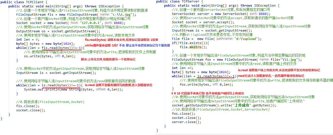 public class TCPClient { public static void main(String[] args) throws IOException { FileInputStream fis = new FileInputStream("c:\\1.jpg"); Socket socket = new Socket("127.0.0.1",8888); OutputStream os = socket.getOutputStream(); int len = 0; byte[] bytes = new byte[1024]; while((len = fis.read(bytes))!=-1){ os.write(bytes,0,len); }