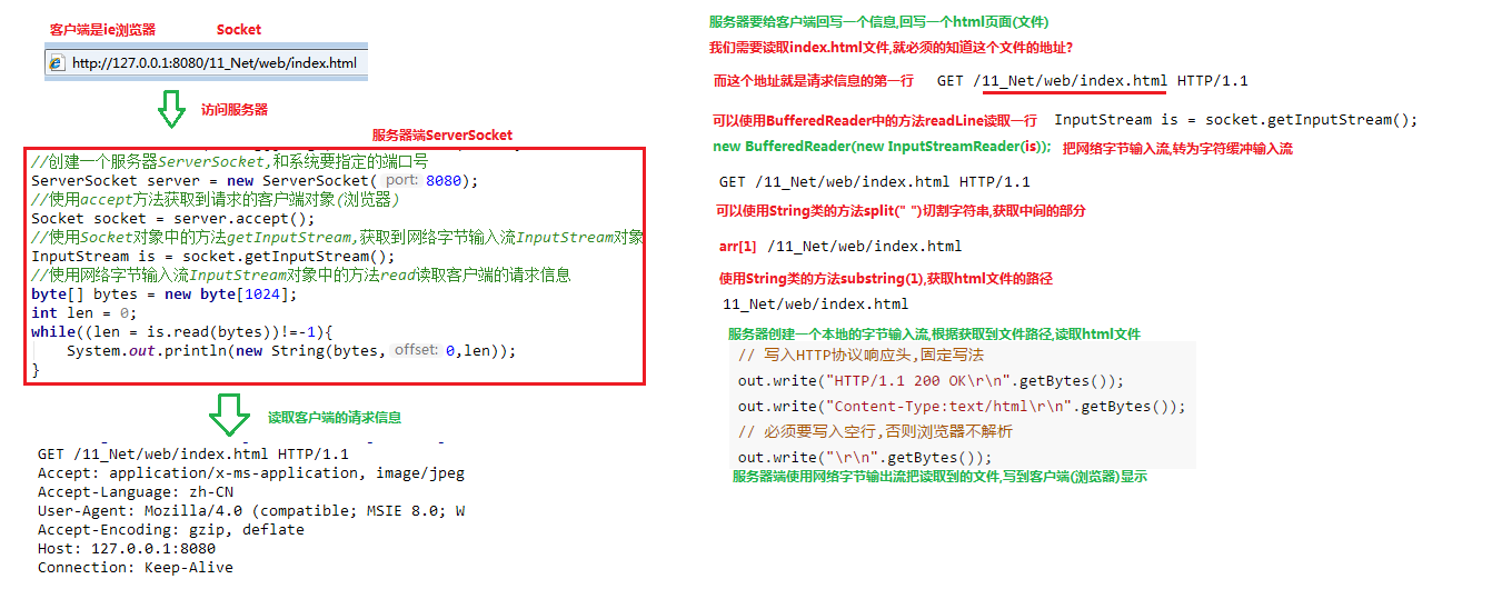 | public class SerDemo { public static void main(String[] args) throws IOException { System.out.println("服务端 启动 , 等待连接 .... "); ServerSocket server = new ServerSocket(8888); Socket socket = server.accept(); BufferedReader readWb = new BufferedReader(new InputStreamReader(socket.getInputStream())); String requst = readWb.readLine(); String[] strArr = requst.split(" "); String path = strArr[1].substring(1); FileInputStream fis = new FileInputStream(path); byte[] bytes= new byte[1024]; int len = 0 ; OutputStream out = socket.getOutputStream(); out.write("HTTP/1.1 200 OK\r\n".getBytes()); out.write("Content-Type:text/html\r\n".getBytes()); out.write("\r\n".getBytes()); while((len = fis.read(bytes))!=-1){ out.write(bytes,0,len); } fis.close(); out.close(); readWb.close(); socket.close(); server.close(); } }