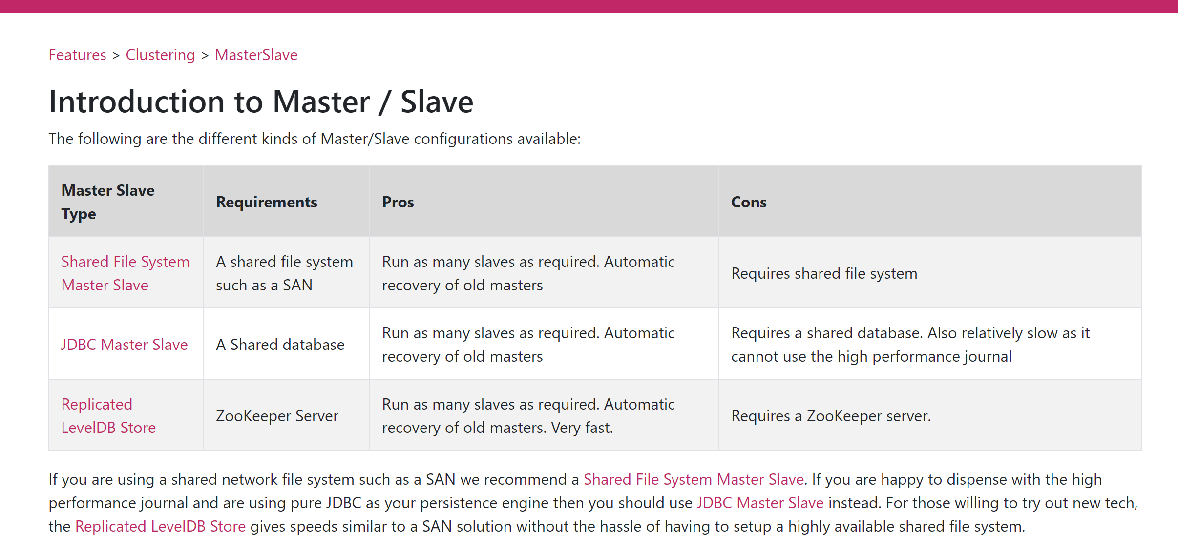 | 从ActiveMQ5.9开始,ActiveMQ的集群实现方式取消了传统的Masster-Slave方式. 增加了基于Zookeeper+LevelDB的Master-Slave实现方式,从5.9版本后也是官网的推荐 基于Zookeeper和LevelDB搭建ActiveMQ集群,集群仅提供主备方式的高可用集群功能,避免单点故障.