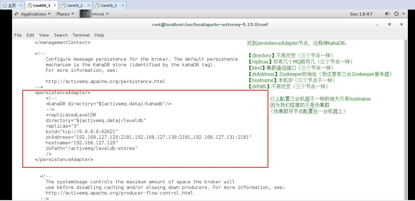 | <persistenceAdapter> <replicatedLevelDB directory="${activemq.data}/leveldb" replicas="3" bind="tcp://0.0.0.0:62621" zkAddress="192.168.10.130:2181,192.168.10.132:2181,192.168.10.133:2181" hostname="192.168.10.130" zkPath="/activemq/leveldb-stores" /> </persistenceAdapter>