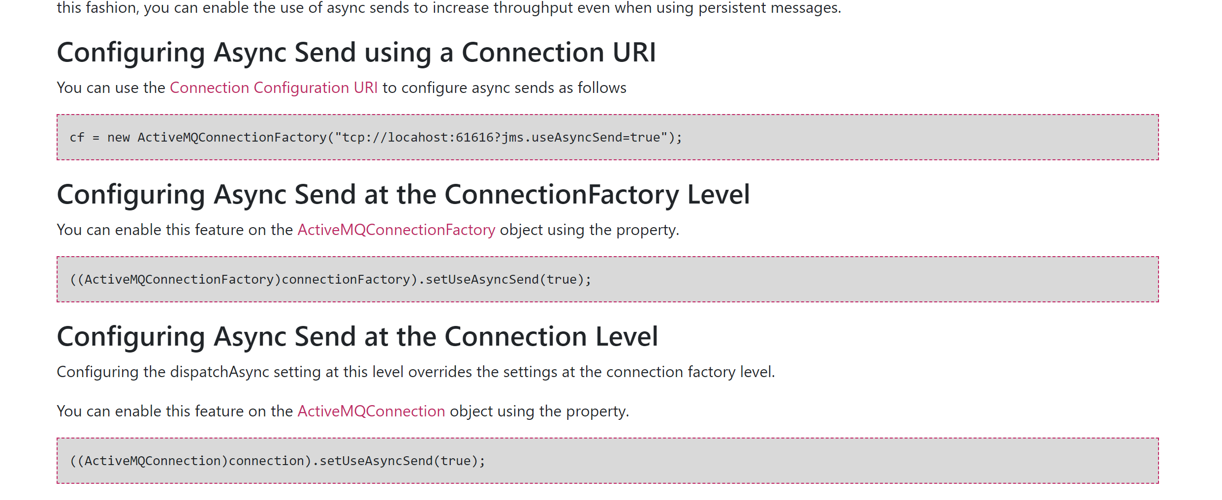 public static void main(String[] args) throws JMSException { ActiveMQConnectionFactory activeMQConnectionFactory = new ActiveMQConnectionFactory(); activeMQConnectionFactory.setBrokerURL(ACTIVEMQ_URL); activeMQConnectionFactory.setUseAsyncSend(true); Connection connection = activeMQConnectionFactory.createConnection(); connection.start();