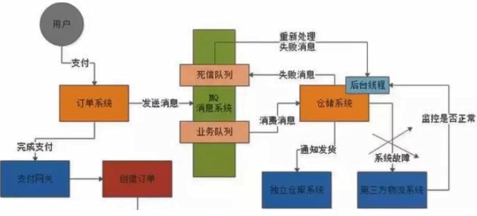 | 一般生产环境中在使用MQ的时候设计两个队列:一个是核心业务队列,一个是死信队列。 核心业务队列,就是如上图专用用来订单系统发送订单消息的,然后另外一个死信队列就是用来处理异常的。 假如第三方物流系统故障了此时无法请求,那么仓储系统每次消费到一条订单消息,尝试通知发货和配送都会遇到对方的接口报错。此时仓储系统 就可以把这个消息拒绝访问或者标志位处理失败,一旦标志这条消息处理失败了之后,MQ就会把这条消息转入提前设置好的一个死信队列中。 然后你会看到的就是,在第三方物流系统故障期间,所有订单消息全部处理失败,全部会转入死信队列。然后你的仓储系统得专门有一个后台线程, 重新执行发货和配送得通知逻辑