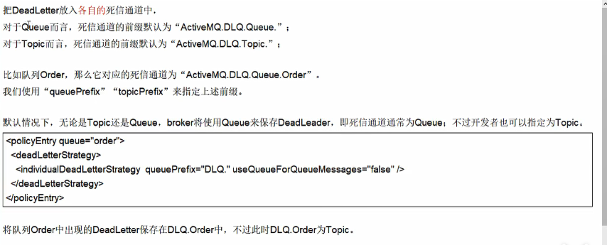 | 将所有的DeadLetter保存在一个共享的队列中,这是ActiveMQ broker端默认的策略。 共享队列默认为“ActiveMQ.DLQ”,可以通过“deadLetterQueue”属性来设定 <deadLetterStrategy> <shareDeadLetterStrategy deadLetterQueue="DLQ_QUEUE"/> </deadLetterStrategy>