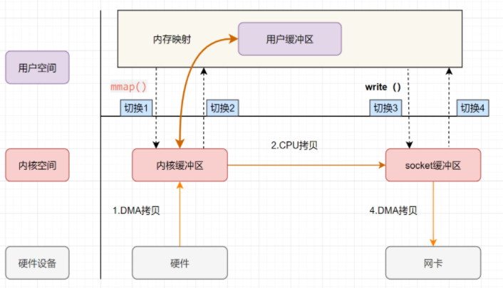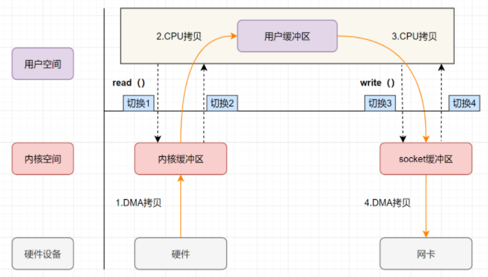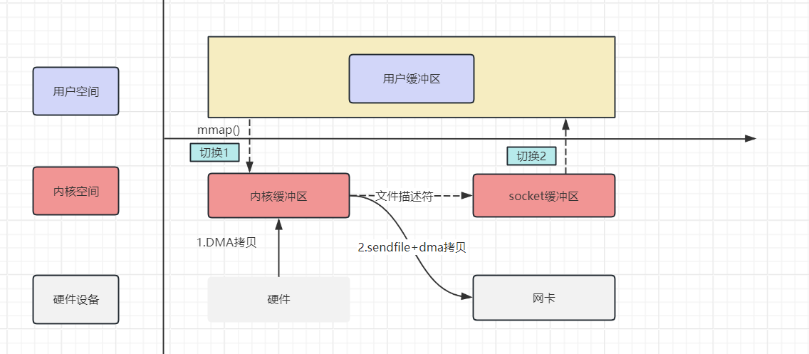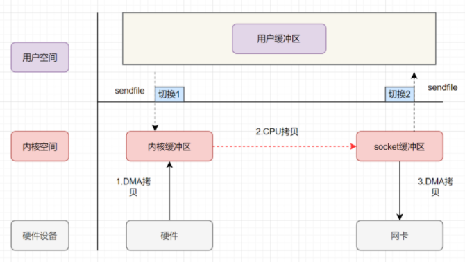 - 上述过程可以看出有4次上下文切换, 4次拷贝. 其实这个地方可以优化, 我们把数据拷贝到用户缓冲区再从用户缓冲区拿出数据到socket纯属多此一举, 如果有一种操作直接可以把数据从内核缓冲区到socket缓冲区的话, 就能减少拷贝操作了