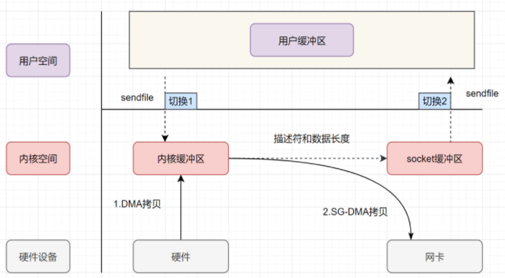 - 上述操作发现, 我们只进行了2次上下文切换, 这下上下文切换好像是优化到极致了,但是依旧是3次拷贝, 如何继续优化拷贝次数? Linux 2.4 版本之后,对 sendfile 做了升级优化,引入了 SG-DMA技术,其实就是对DMA拷贝加入了 scatter/gather 操作,它可以直接从内核空间缓冲区中将数据读取到网卡,无需将内核空间缓冲区的数据再复制一份到 socket 缓冲区,从而省去了一次 CPU拷贝。