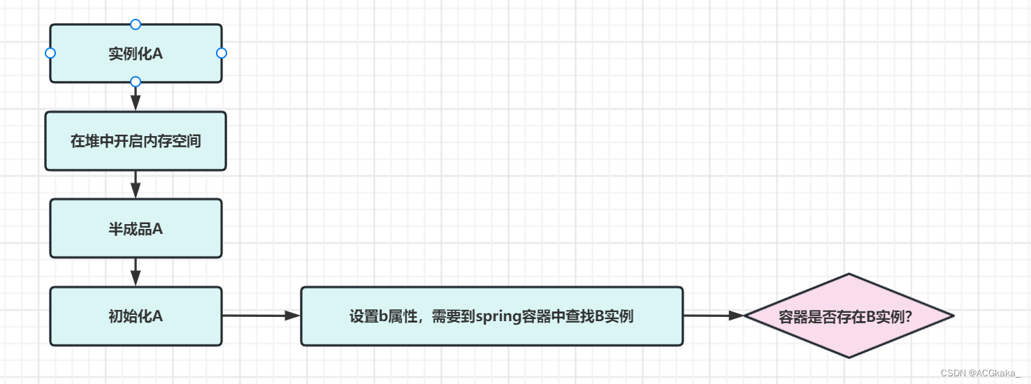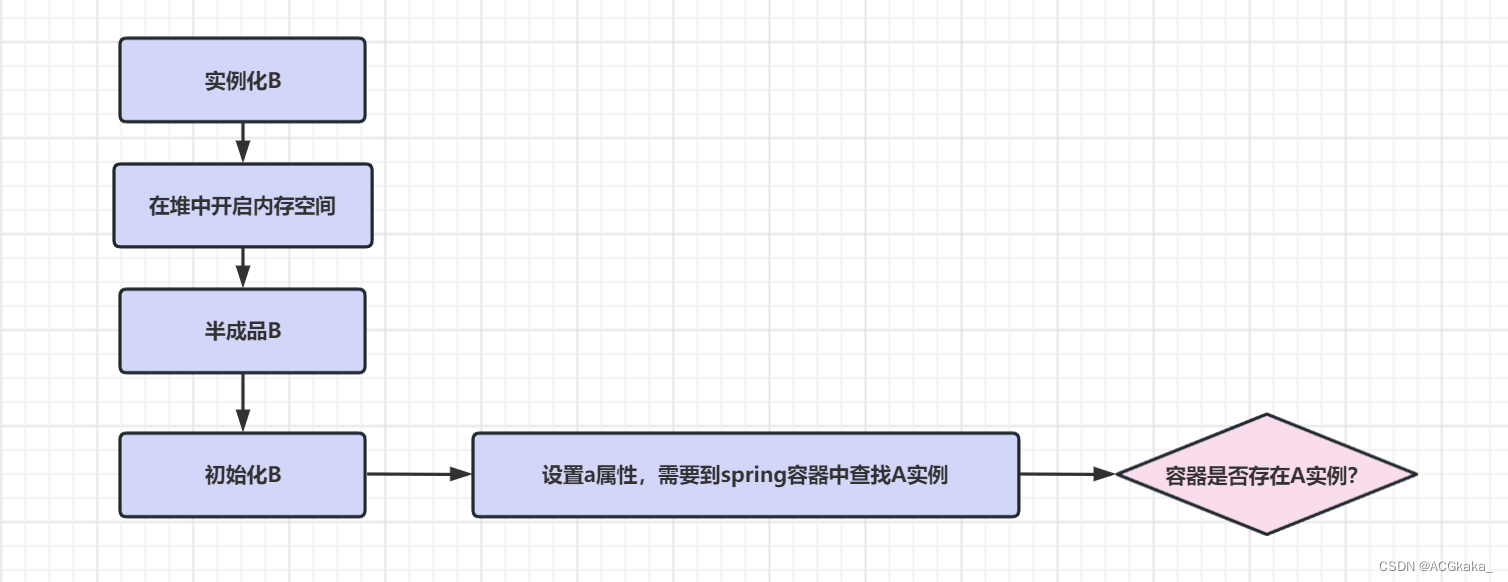 当 Spring 框架启动后,开始根据注解将类 A 实例化并注入到容器当中,在实例化 A 之后就会尝试获取类 B 的实例来进行依赖注入。