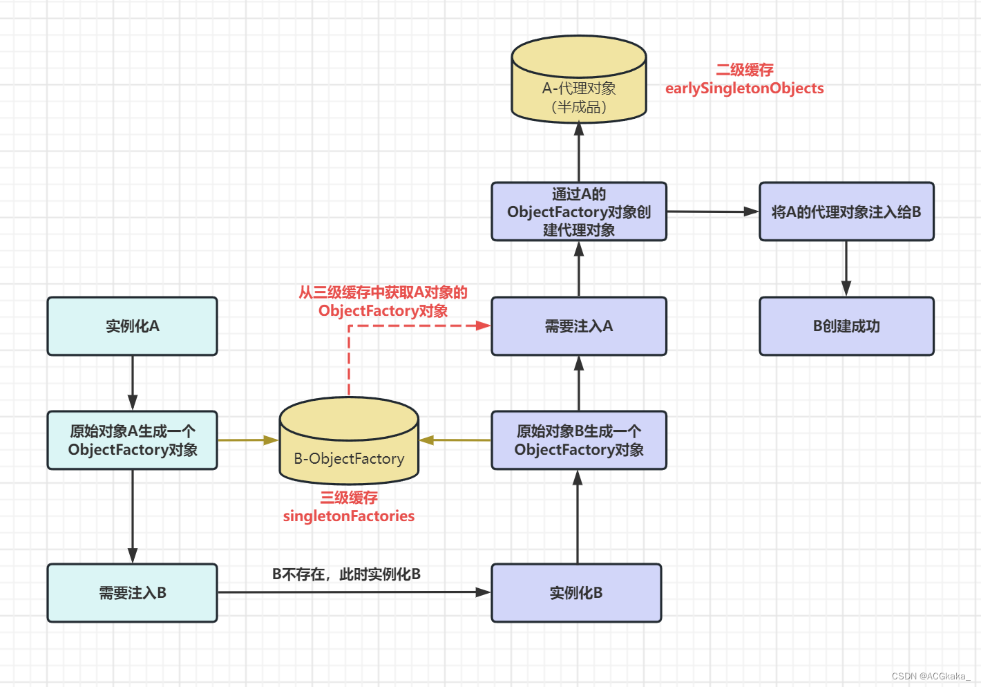 然后,我们通过A的ObjectFactory对象创建A的代理对象(半成品/原始对象),然后将A的代理对象注入给B,就可以将B创建成功。