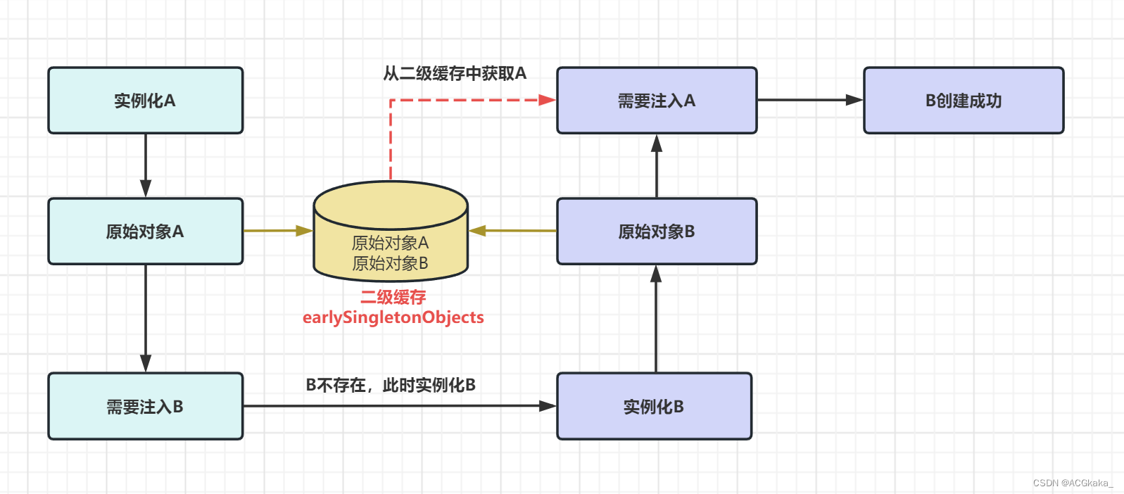 如果想打破上面循环依赖的死循环,就需要一个中间人来将已经实例化但是没有完成依赖注入的对象给缓存起来,这个中间人就是二级缓存。
