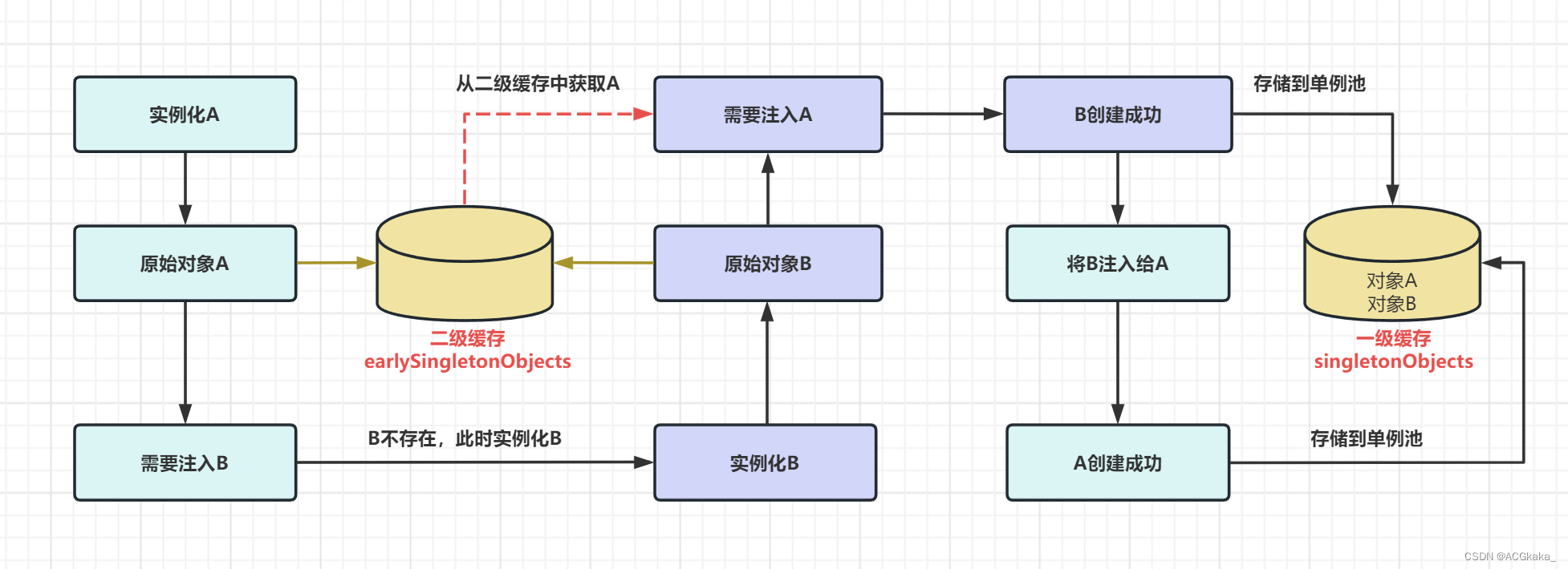 最后,我们将创建好的B放入单例池中,然后将B注入给A,这样我们就可以最终将A创建成功,然后将创建好的A再放入单例池中。