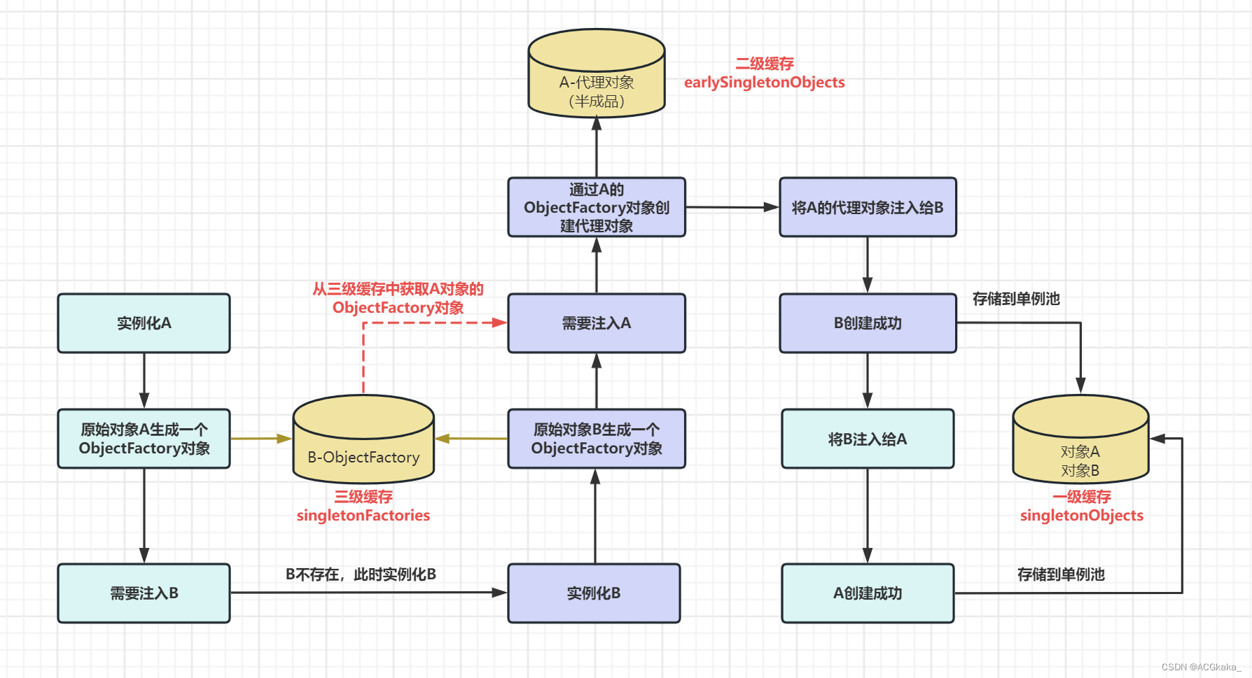 首先,我们在实例化A之后,将A中用于创建代理对象A的工厂对象 A-ObjectFactory,和B中用于创建对象B的工厂对象 B-ObjectFactor 放到三级缓存中。